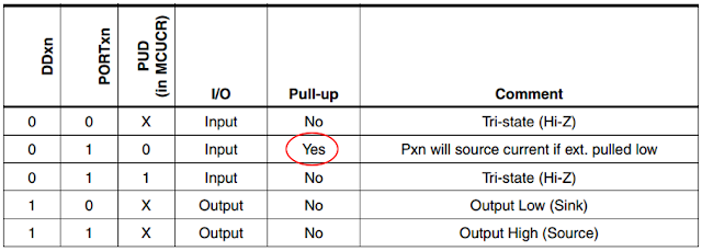 - DDRxn과 PORTxn, PUD(MCUCR Rg)에 따른 Port Pin 구성과 상태.